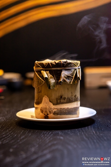 ตัวแป้งกรอบเบาละมุนคลุกเคล้าชาร์โคลจนได้สีดำเด่น ตัวไส้เป็นตับห่านซอสฉ่ำๆ ปิดทองคำหรูหราสวยงาม แนะนำให้ทานคู่กับจลาตินและมะเขือเทศที่ให้รสเปรี๊ยวเพิ่มความนัวที่จะลืมเมนูเผือกทอดในอดีตได้เลย ทำได้ดี