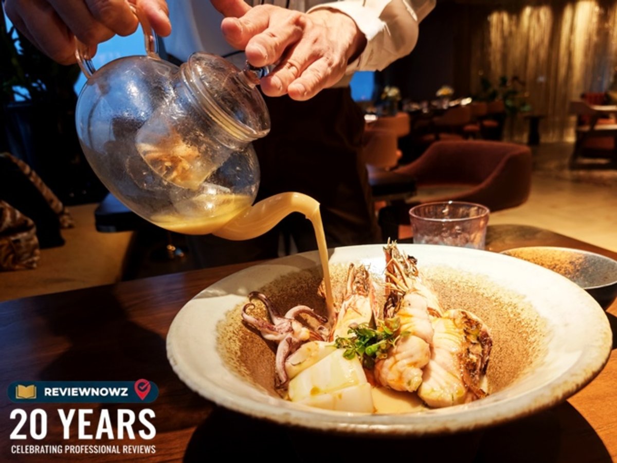 ต้มข่าทะเลที่มีกุ้งแช่บ๊วย ปลาหมึก หอยนางรม และปลาประจำวัน โดยจะมีพนักงานมารินน้ำซุปให้ก่อนทาน