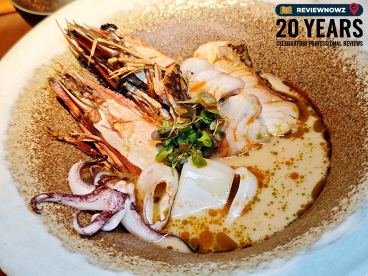 ต้มข่าทะเลที่มีกุ้งแช่บ๊วย ปลาหมึก หอยนางรม และปลาประจำวัน โดยจะมีพนักงานมารินน้ำซุปให้ก่อนทาน