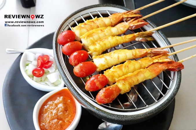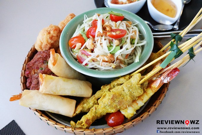 มีทอดมันกุ้งชิ้นใหญ่หนาเนื้อแน่นหวาน ทอดมันปลาหอมเนื้อดี ปอเปี๊ยะทอดผิวกรอบเนื้อในนุ่มให้กุ้งเป็นตัวๆ หมูและกุ้งสะเต๊ะหมักจนหอมเครื่อง และส้มตำไทยตัดรส ปริมาณ 2-4 คนกำลังชิม แนะนำ