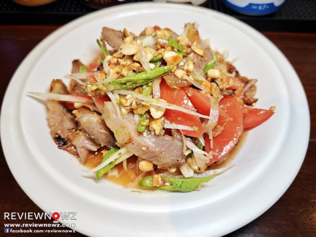 เนื้อหมูติดมันชิ้นใหญ่เต็มปากเต็มคำเนื้อนุ่มและมีรสชาติในตัวเองชัดเจนได้ เครื่องเคราต่างๆสดสะอาดดูดี ดูๆแล้วให้อามรณ์ของส้มตำไทยคอหมูย่าง ปรุงครบรสแต่ไม่จัดจ้าน เหมือนส้มตำไทยที่ออกเค็มนำเบาๆ แต่อ่อนรสเปรี๊ยวหวาน มาตรฐานที่ดี