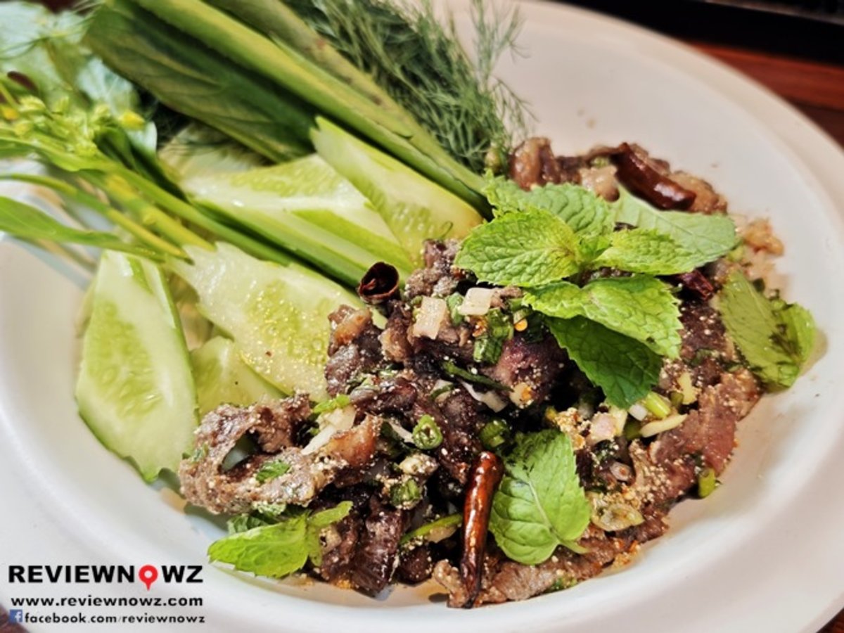 เนื้อย่างเสียบไม้ ขนาด 4-5 คำ ปริมาณดูดีทีเดียว ทานแล้วมีความหอมชัด เนื้อนุ่มกำลังเคี้ยวมีรสชาติในตัวเองเบาๆ เครื่องลาบวางบนเนื้อจนล้น ทานแล้วกลิ่นรสของความเป็นลาบค่อนข้างอ่อน ทำให้บรรดาผักที่เป็นเครื่องลาบนั้นเด่นทั้งกลิ่นรสและเนื้อสัมผัสเกินไป