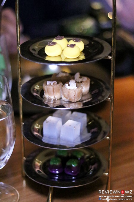 เสริฟ์มาเป็นชั้นวางกับ ‘ข้าวตูข้าวดอกน้ำผึ้งเกสรดอกลำไย, เสน่ห์จันทร์หอม, วุ้นกรอบทองคำ, และลูกชุปมังคุดเสวย’