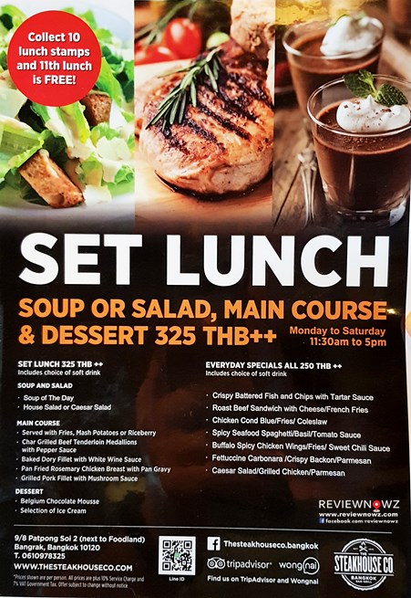 ร้าน The Steakhouse Co. Bangkok ที่ซอยพัฒน์พงศ์ 2 ข้างฟู้ดแลนด์ (Foodland) พึ่งเปิดตัวโปรโมชั่นใหม่ล่าสุดไปกับอาหารชุดมื้อกลางวัน 3 คอร์สเป็นซุปหรือสลัด, จานหลัก, และของหวาน รวมเครื่องดื่มให้เรียบร้อยในราคา 325++ บาท ซึ่งให้บริการทุกวันจันทร์ถึงวันเสาร์ทั้งวันตั้งแต่สิบเอ็ดโมงครึ่งยิงยาวถึงห้าโมงเย็นกันเลย ไปชิมด้วยกันครับ